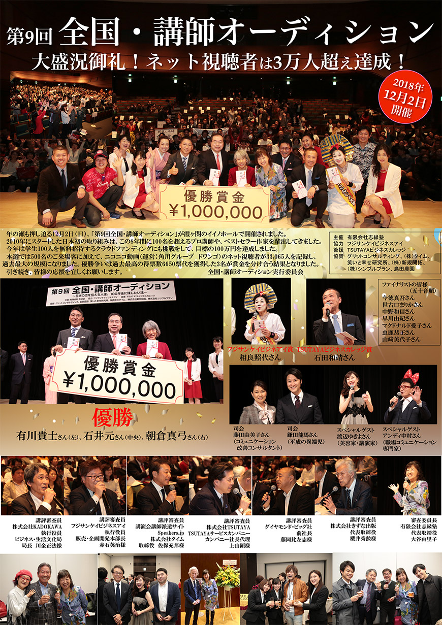 本選の写真2019年の記録 1.リハーサル 2.エントランス 3.楽屋 4.会場内 5.ファイナリスト 6.大谷由里子のトークライブ 7.授賞式 8.懇親会 本選の写真2018年の記録 1.リハーサル 2.エントランス 3.楽屋 4.会場内 5.ファイナリスト 6.講評の様子 7.大谷由里子のトークライブ 8.授賞式 9.懇親会 Tweet